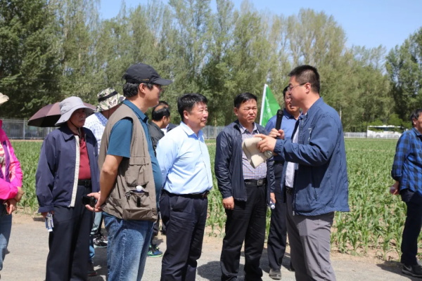 在甘州区党寨镇下寨村玉米制种膜下滴灌智能技术核心示范区,代表们听取了张掖市农业科学研究院党委书记、院长刘建勋研究员关于玉米制种膜下滴灌水肥一体化控制技术:“9812”膜下滴灌节水技术、平衡施肥技术、水肥一体化智能控制技术的介绍,这些技术的实施为玉米生产节药20%,节肥30%,节水40%,节种50%,节约劳力90%(灌溉施肥部分),较农民习惯种植亩节本增效300元。