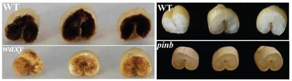 编辑后的Pinb基因编码区缺失34bp,这是迄今为止在小麦pinb基因中创制的第一个大片段缺失材料,突变体的硬度指数由18.2提高到73.4,大大提高其籽粒硬度,一步将软质小麦变成了硬质小麦。编辑后的Waxy基因在编码区缺失1bp,纯合突变体籽粒碘染色变为红棕色,这是糯小麦的典型特征,表明1个碱基的缺失就可以将非糯小麦转化为糯小麦。编辑后的Ppo基因编码区缺失2bp,其籽粒PPO活性由9.0U•g-1min-1降低到1.24U•g-1min-1,活性降低了90%,显著降低了面制品褐变水平。编辑后的Psy基因突变体的黄色素含量平均值由2.81mg/kg降低到1.68mg/kg,面粉白度显著提高。