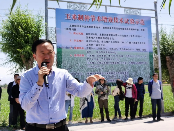 在甘州区党寨镇下寨村玉米制种膜下滴灌智能技术核心示范区,代表们听取了张掖市农业科学研究院党委书记、院长刘建勋研究员关于玉米制种膜下滴灌水肥一体化控制技术:“9812”膜下滴灌节水技术、平衡施肥技术、水肥一体化智能控制技术的介绍,这些技术的实施为玉米生产节药20%,节肥30%,节水40%,节种50%,节约劳力90%(灌溉施肥部分),较农民习惯种植亩节本增效300元。